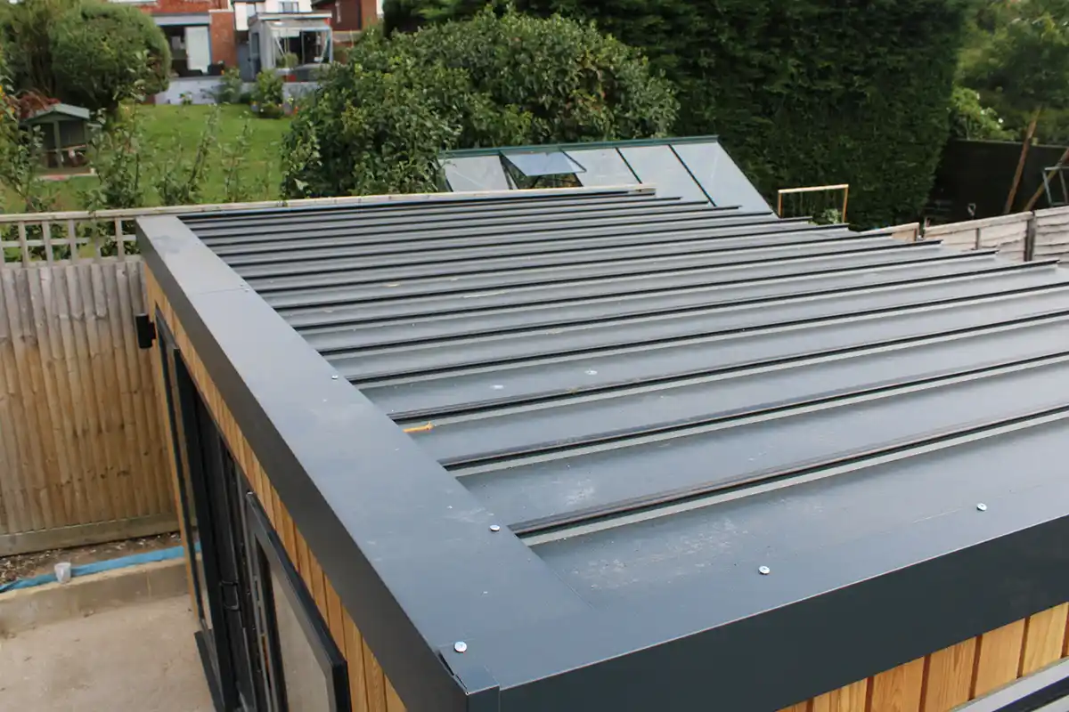The roof is composed of 125mm thick insulated SIPS panel and covered with highly durable EPDM rubber, with plastisol-coated steel anthracite edging. The roof pitch has a slight slope from front to back, allowing water to run off efficiently to the rear guttering system and downpipe. We provide 4” wide guttering is provided as standard to manage the flow of water from the roof and away from your garden room.